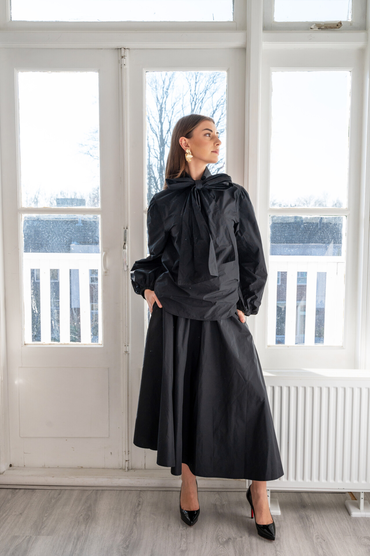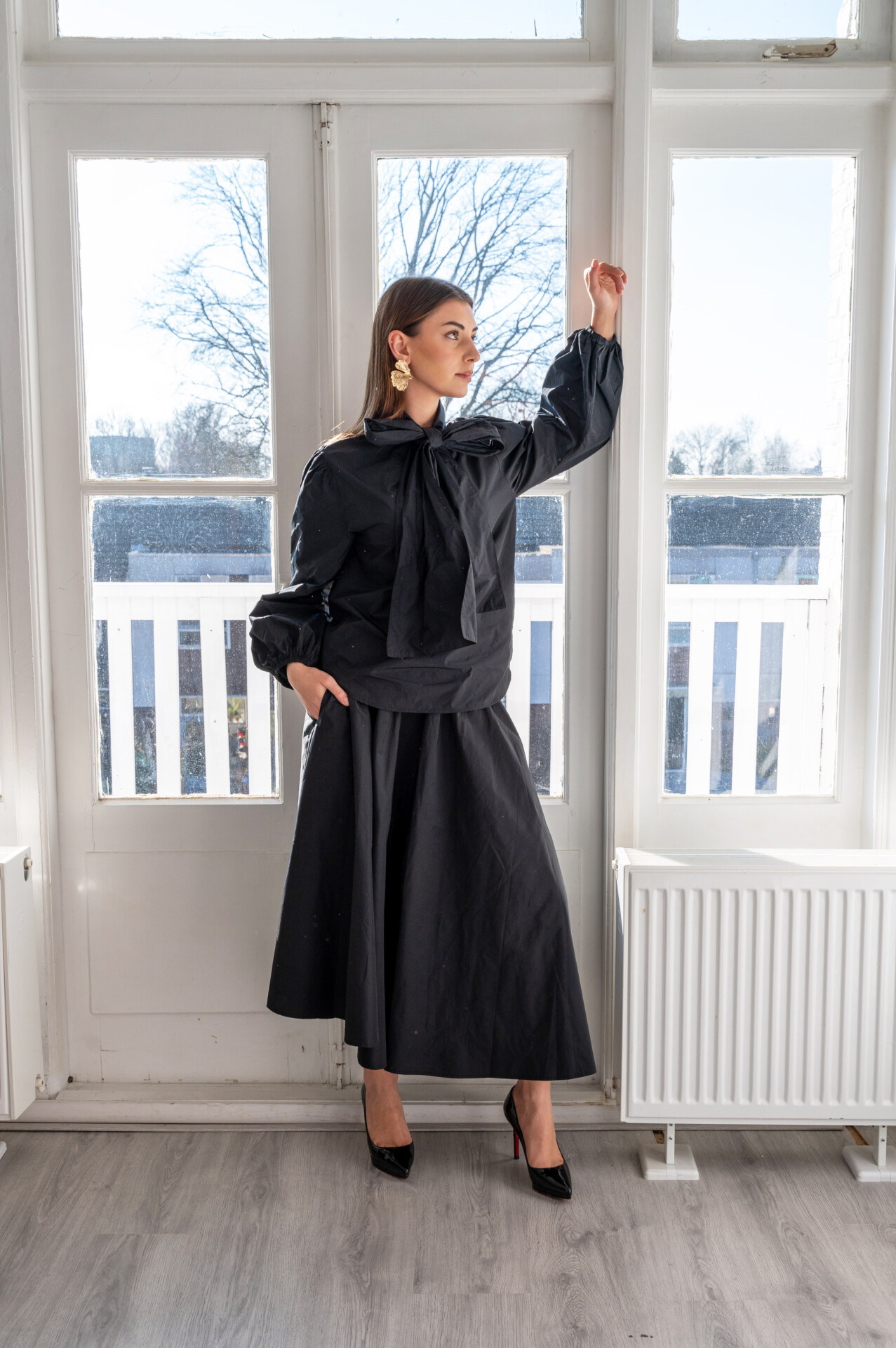 Omschrijving: Deze klassieke zwarte blouse combineert een moderne uitstraling met praktische details. De stevige, gladde stof geeft het ontwerp een luxe, gestructureerde look, terwijl de rijke chocoladebruine kleur zorgt voor een warme en tijdloze uitstraling. De blouse heeft een licht cropped fit, waardoor hij net boven de heup valt en perfect te combineren is met hoge tailles of losse, vloeiende broeken.