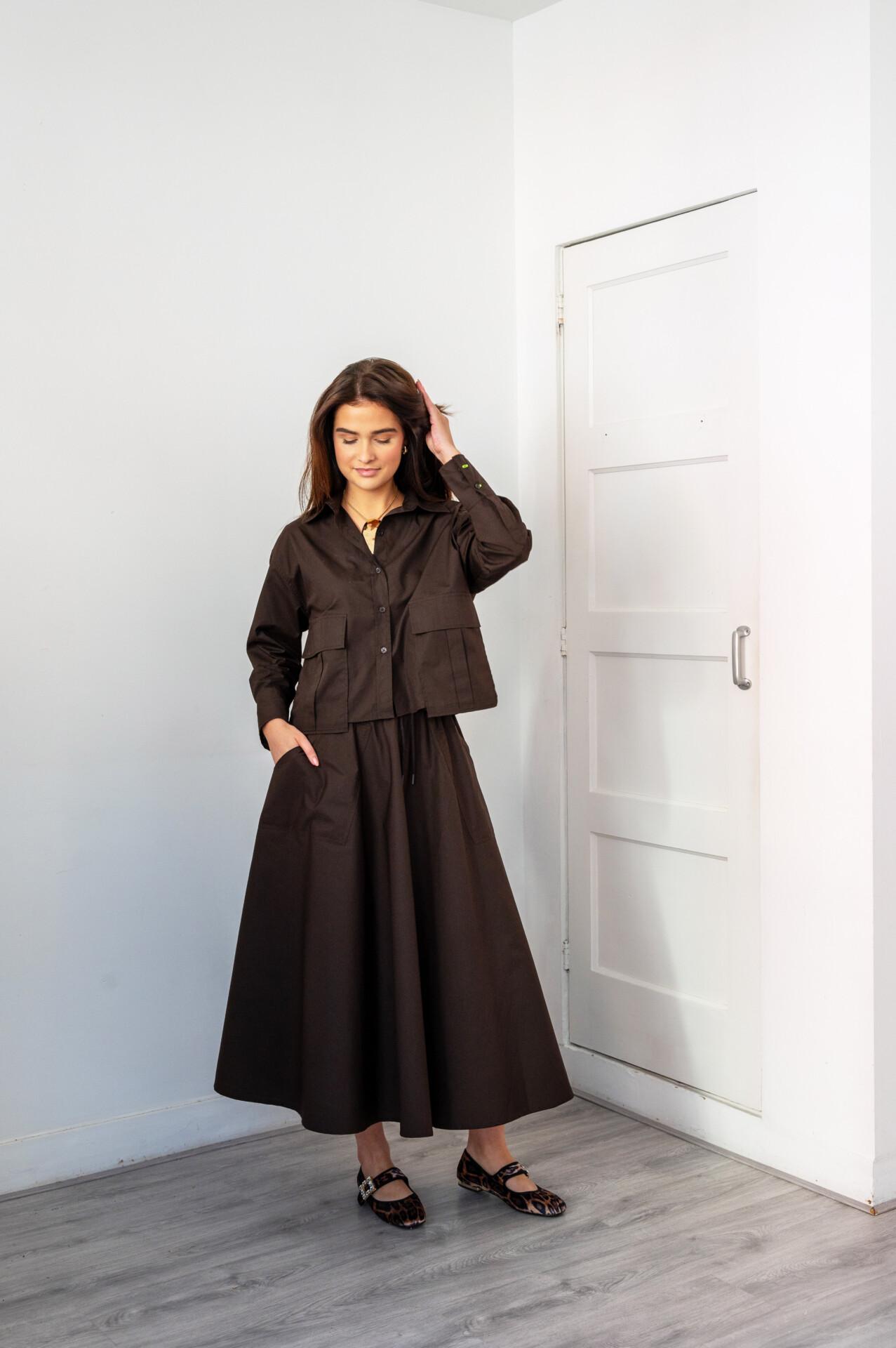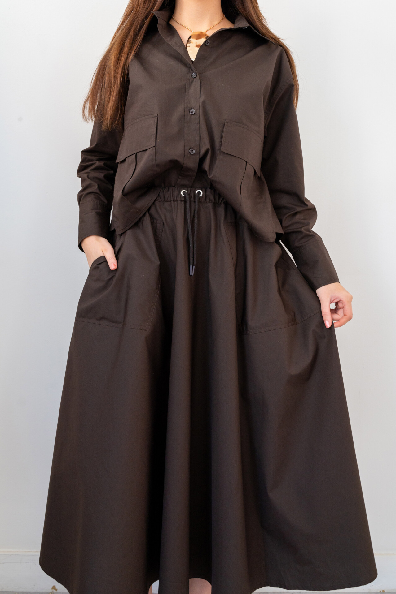 Omschrijving: Deze elegante maxirok in een diepe chocoladebruine kleur heeft een tijdloze en verfijnde uitstraling. De rok is gemaakt van een stevige, soepelvallende stof die mooi volume geeft zonder zwaar aan te voelen. Dankzij de wijd uitlopende A-lijn pasvorm creëert de rok een flatterend silhouet dat comfortabel meebeweegt bij elke stap.