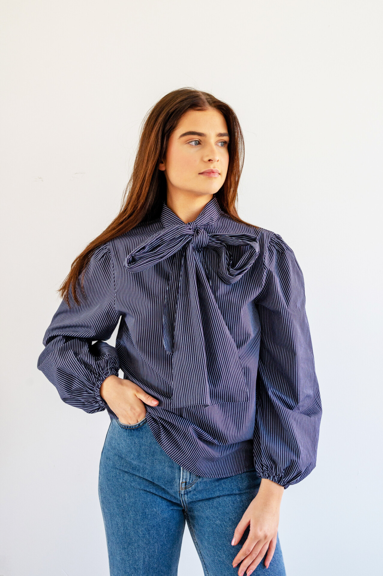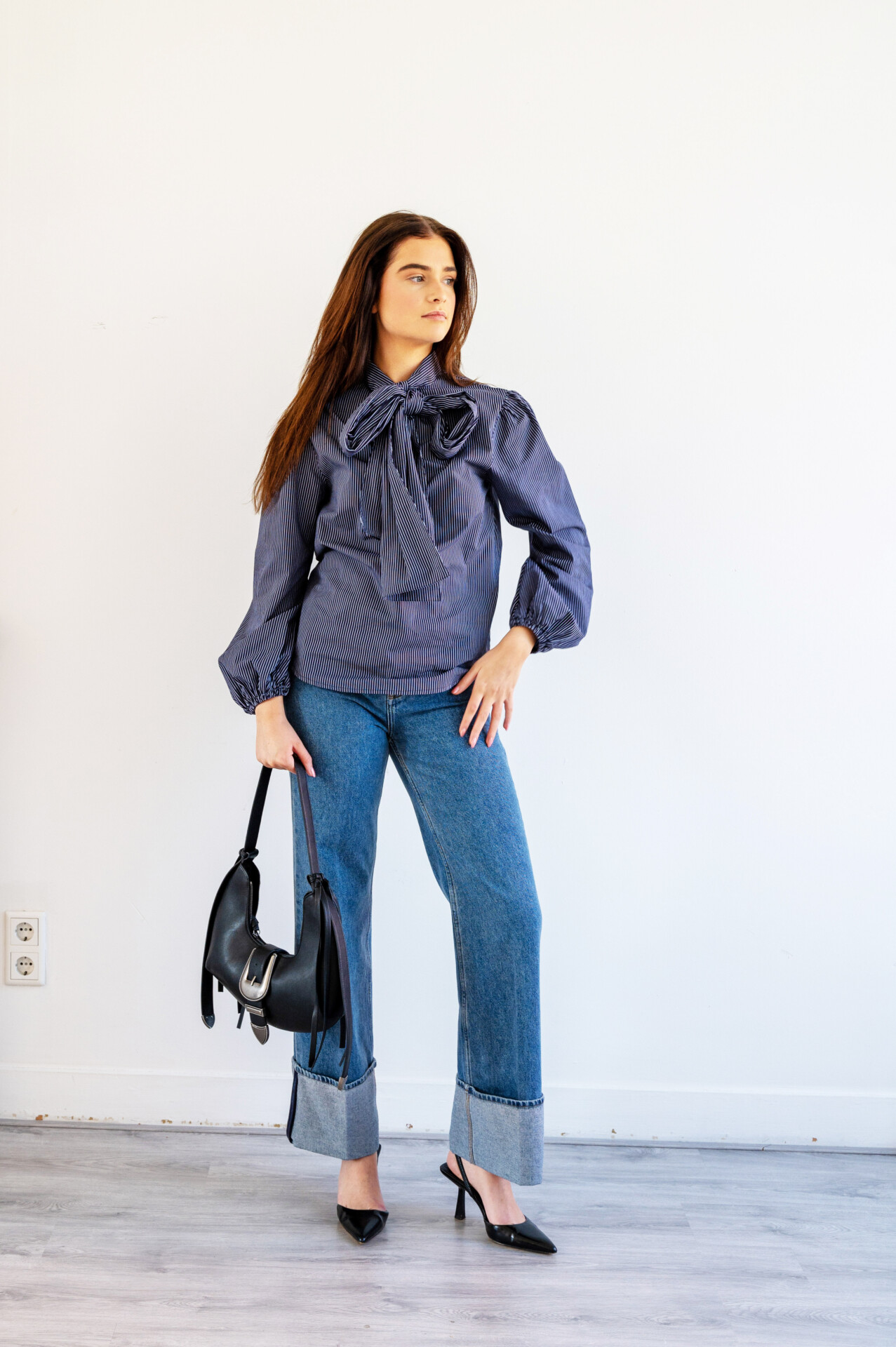 Omschrijving: Voeg een vleugje elegantie toe aan je garderobe met deze stijlvolle gestreepte blouse in een diepe blauwe kleur. De blouse heeft een luxueuze, subtiel glanzende uitstraling en valt soepel over het bovenlichaam. Het uitgesproken strikdetail bij de hals geeft het ontwerp een chique, vrouwelijke look. Perfect voor zowel zakelijke outfits als feestelijke gelegenheden.