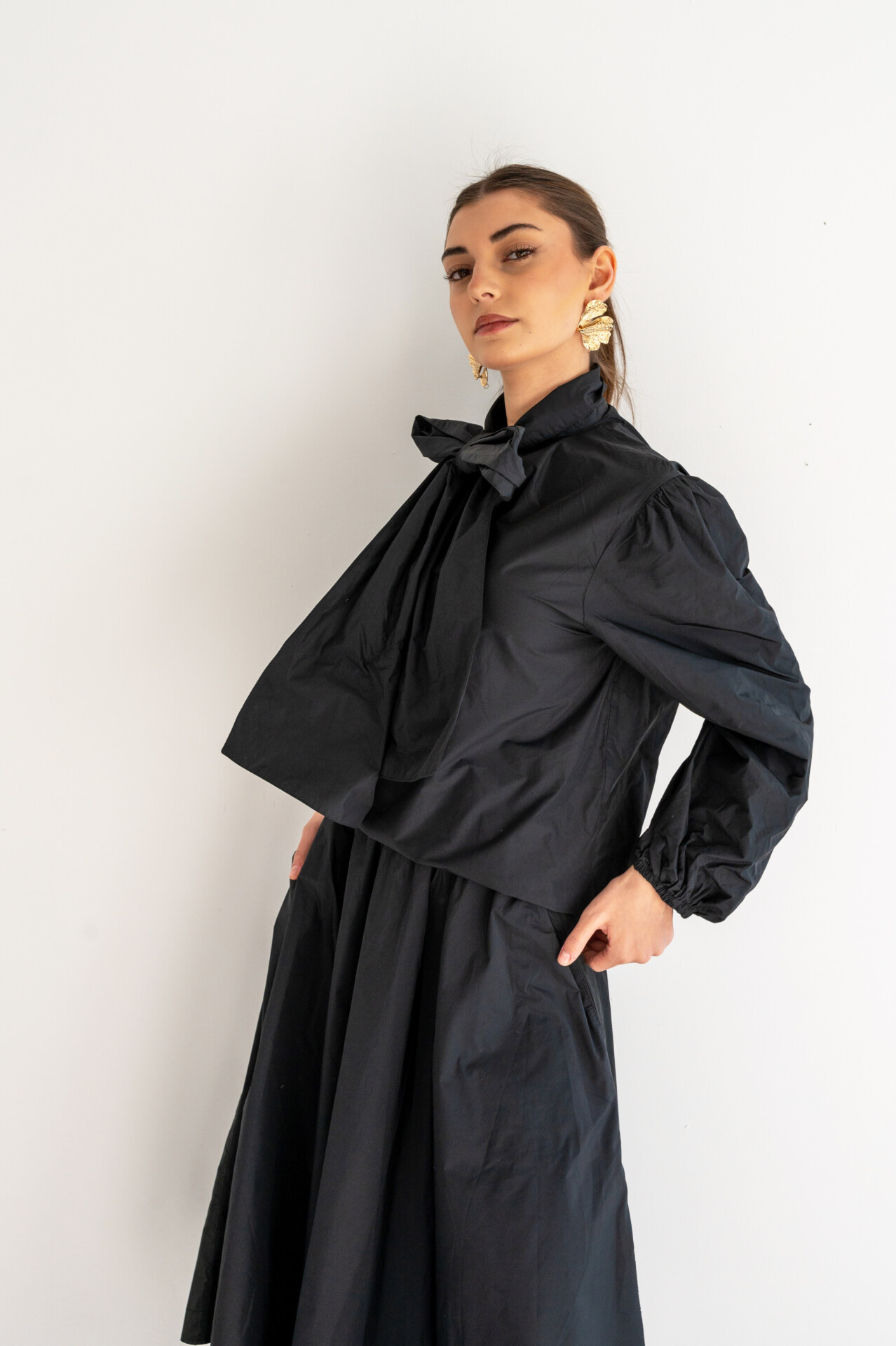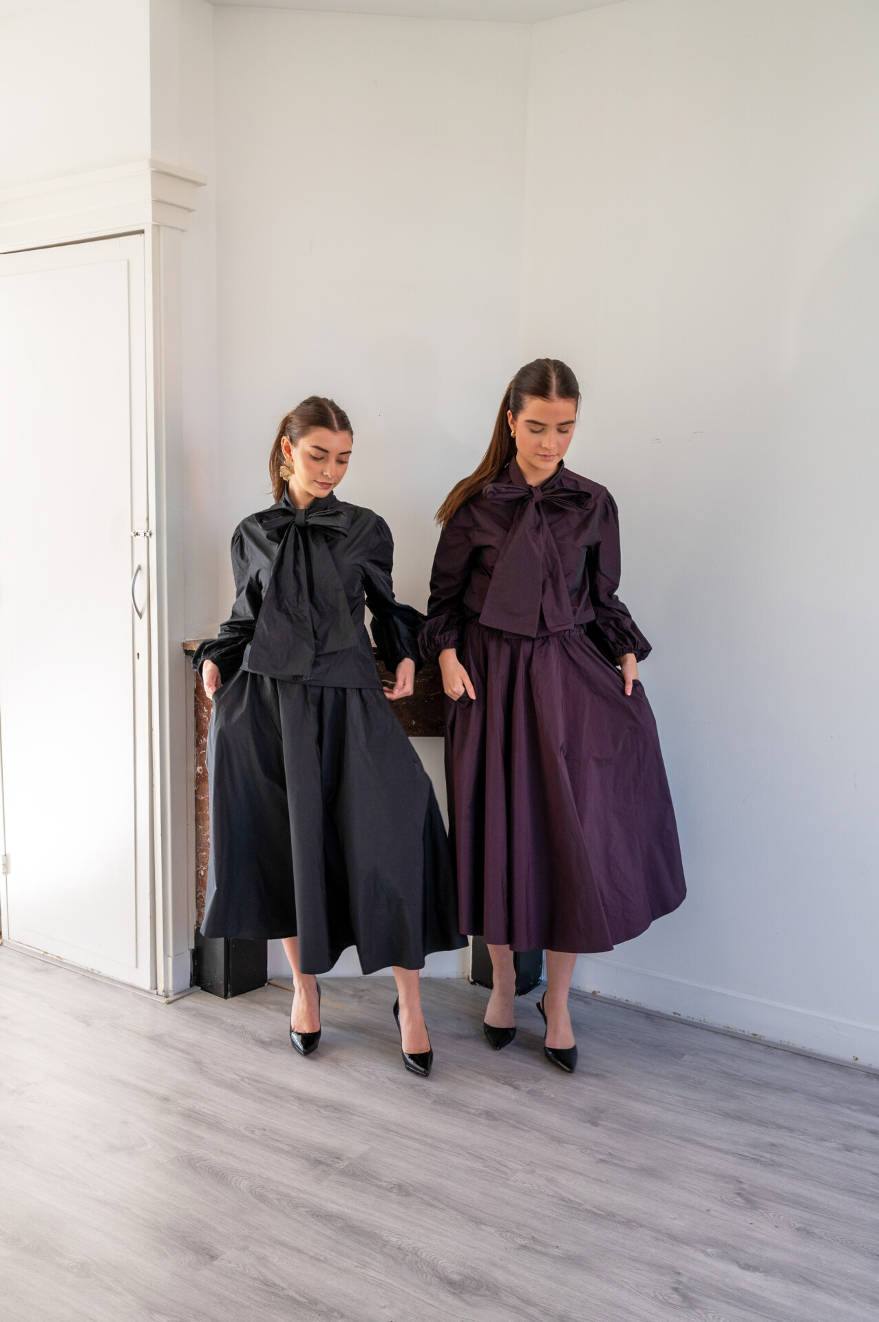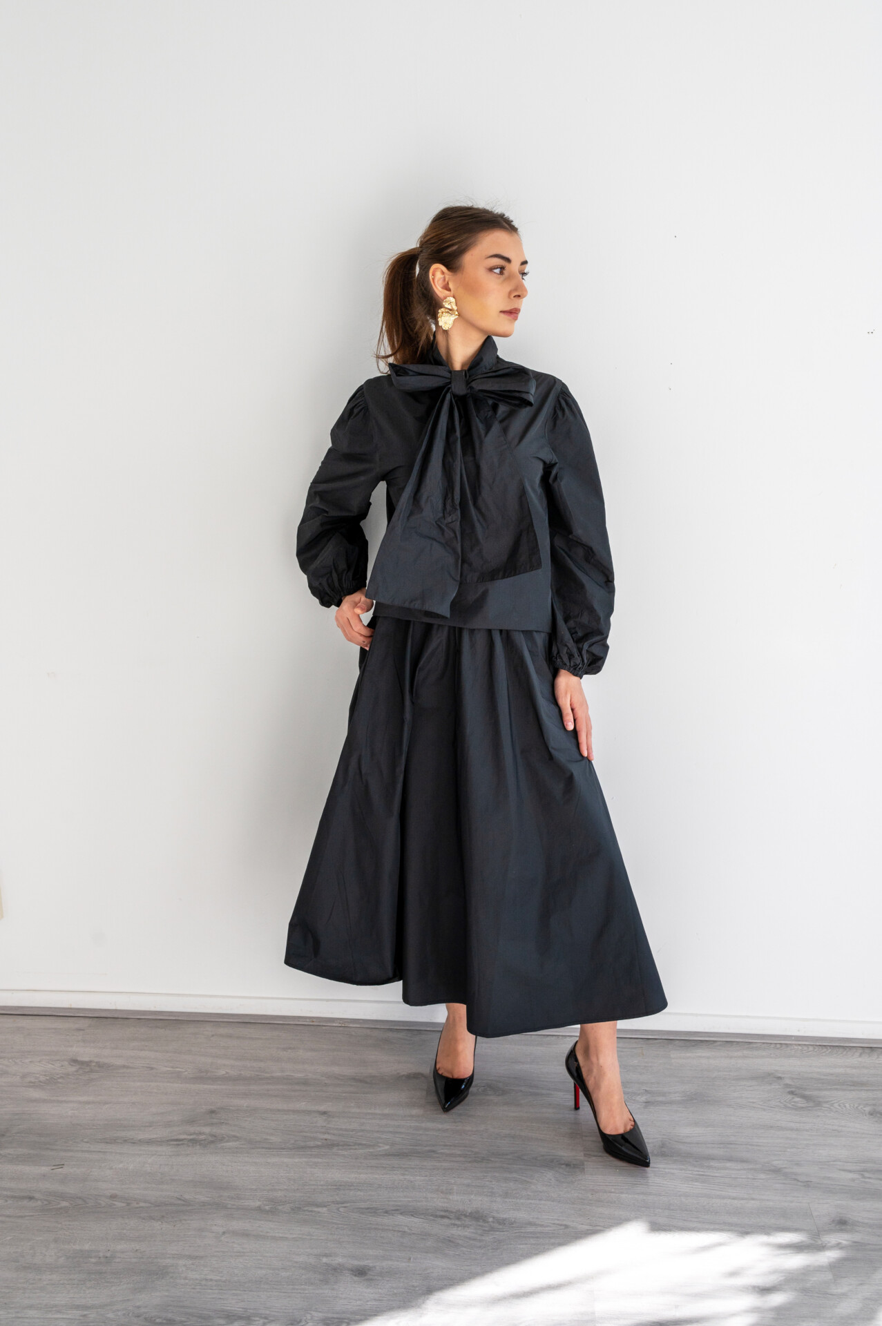 Omschrijving: Deze stijlvolle midi-rok in een klassieke zwarte kleur heeft een elegante en moderne uitstraling. De rok is gemaakt van een stevige, soepelvallende stof die prachtig volume geeft en sierlijk meebeweegt. De wijd uitlopende snit zorgt voor een vrouwelijk silhouet en biedt veel draagcomfort bij elke beweging..